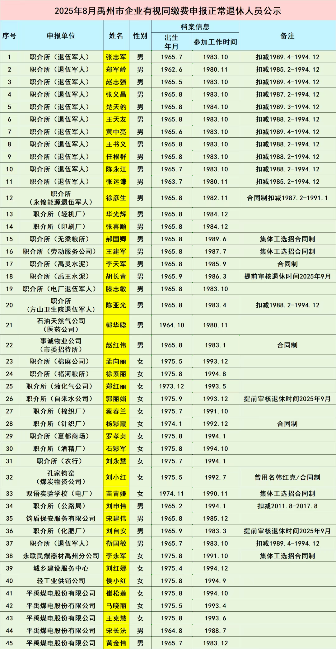2025年8月禹州市企业有视同缴费正常退休人员公示