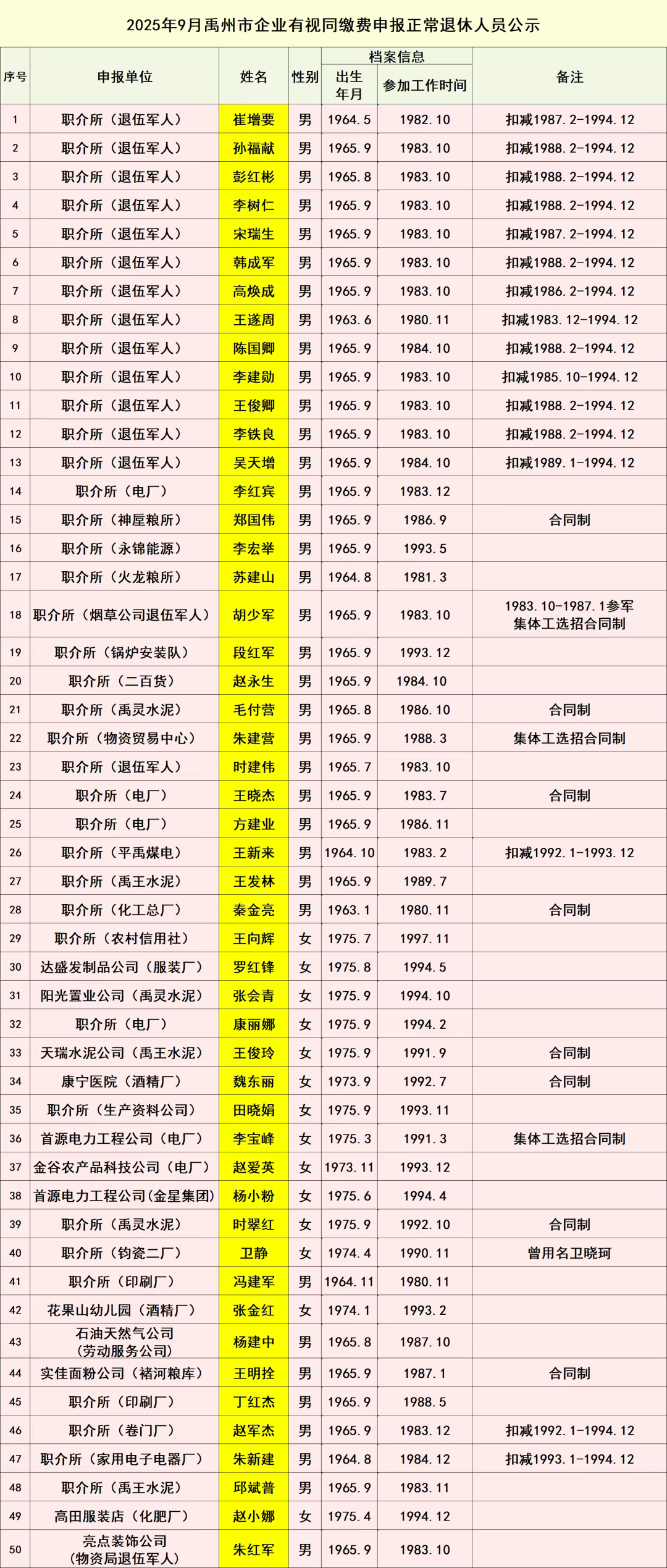 2025年9月禹州市企业有视同缴费正常退休人员公示