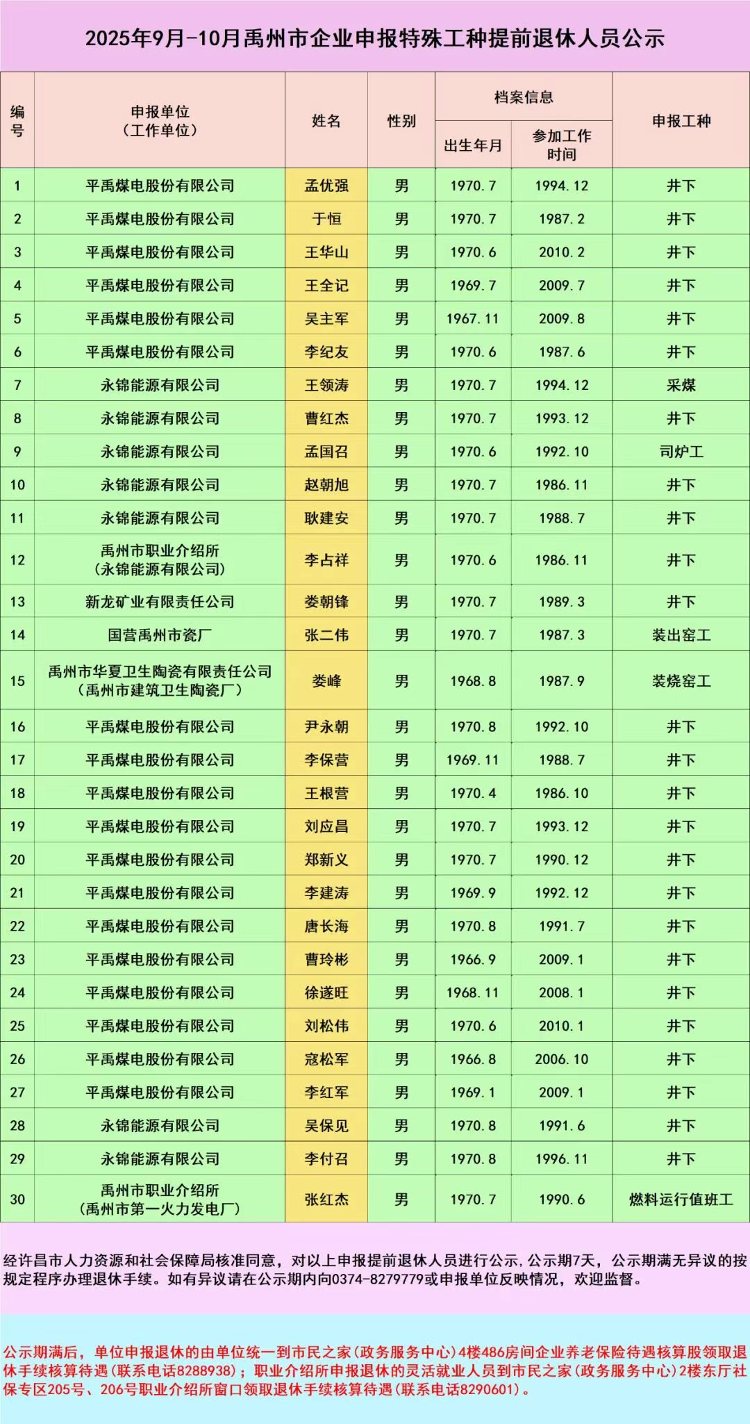 2025年9月-10月禹州市企业申报特殊工种提前退休人员公示