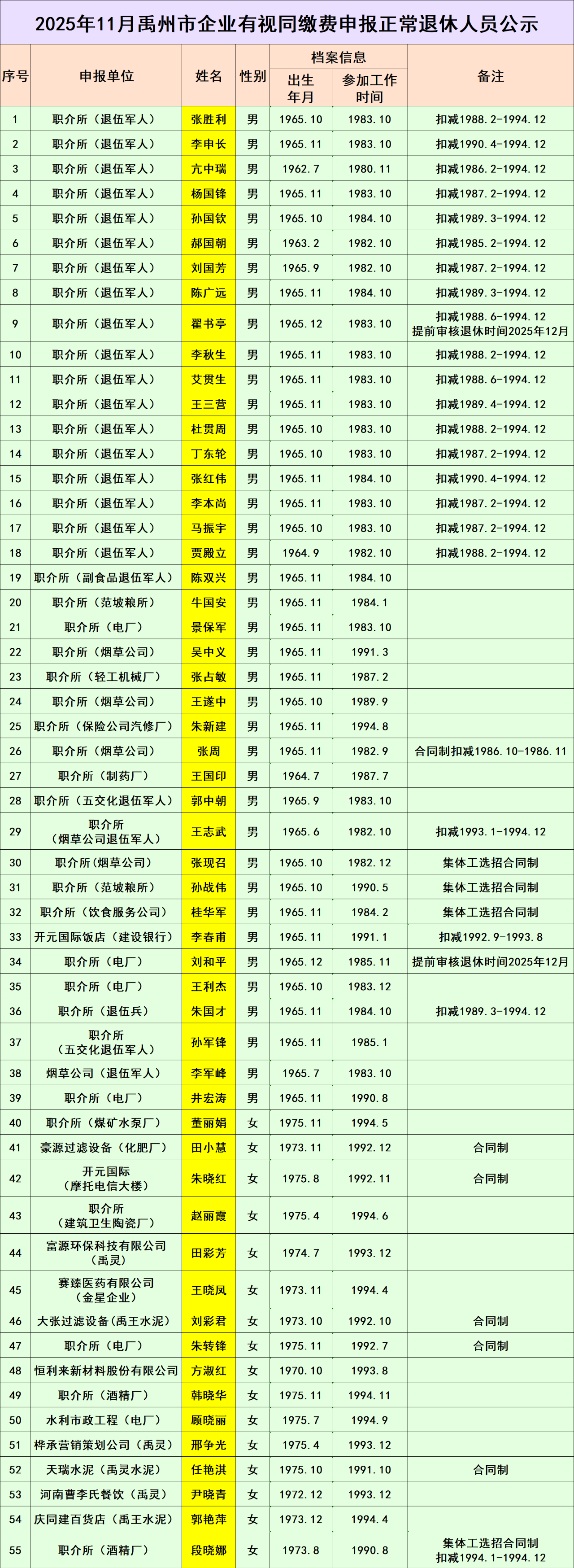 2025年11月禹州市企业有视同缴费正常退休人员公示