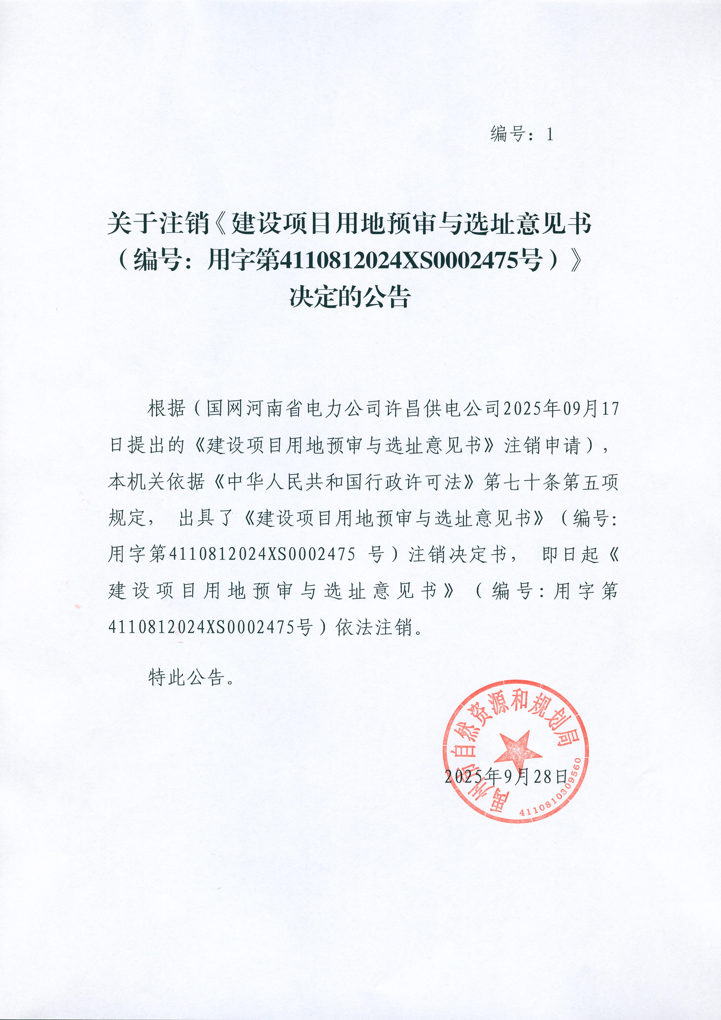 关于注销《建设项目用地预审与选址意见书》