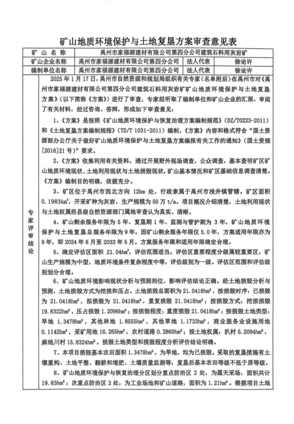 根据国土资规【201621号《国土资源部办公厅关于做好矿山地质环境保护与土地复垦方案编报有关工作的通知》文件精神,我局现对《禹州市家福源建材有限公司第四分公司、禹州市隆盛建材有限公司建筑石料用灰岩矿矿山地质环境保护与土地复垦方案》专家评审意见(见附件)进行公告,公示期7天,自发布之日至202547日。