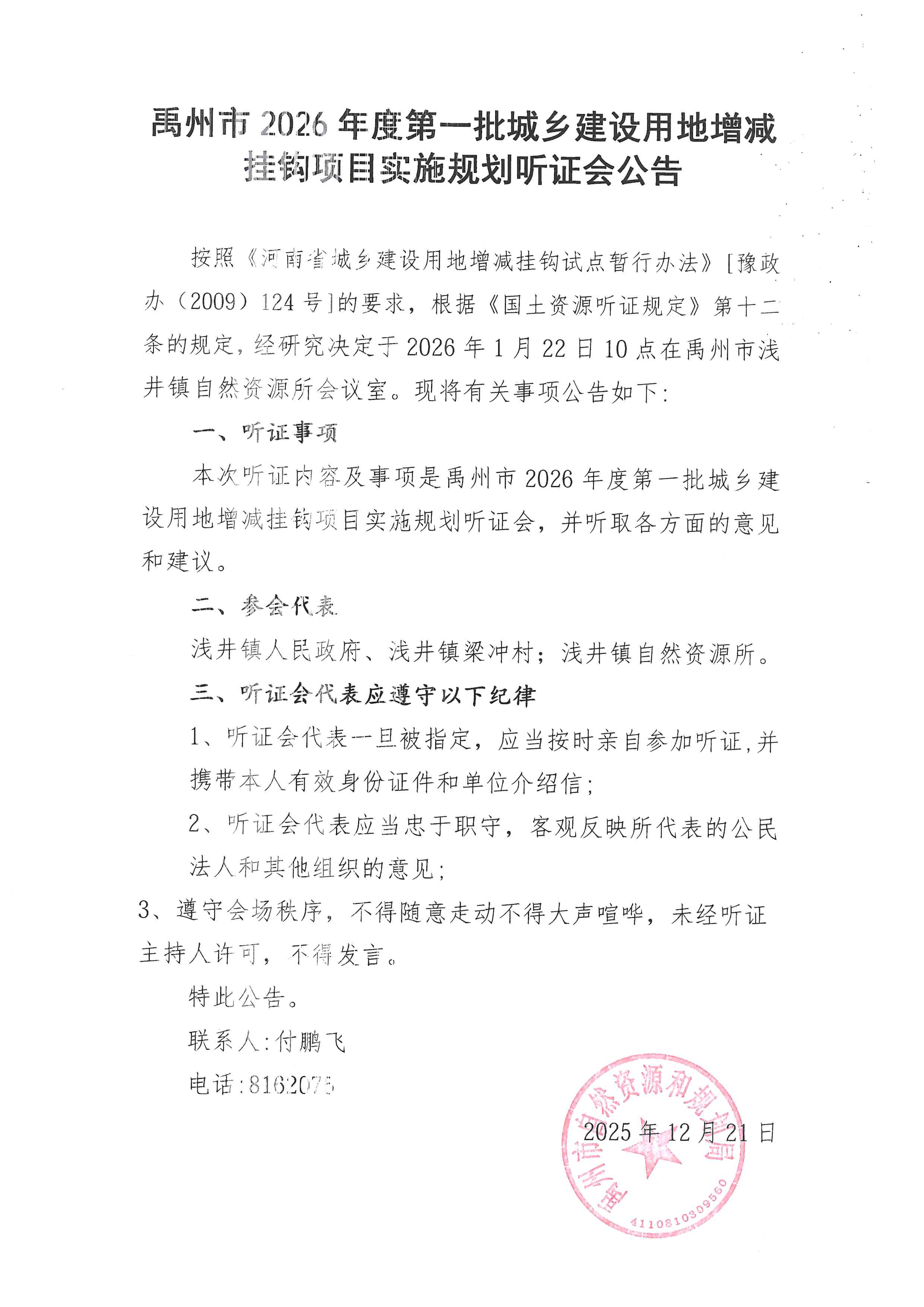 禹州市2026年度第一批城乡建设用地增减挂钩项目实施规划听证会公告