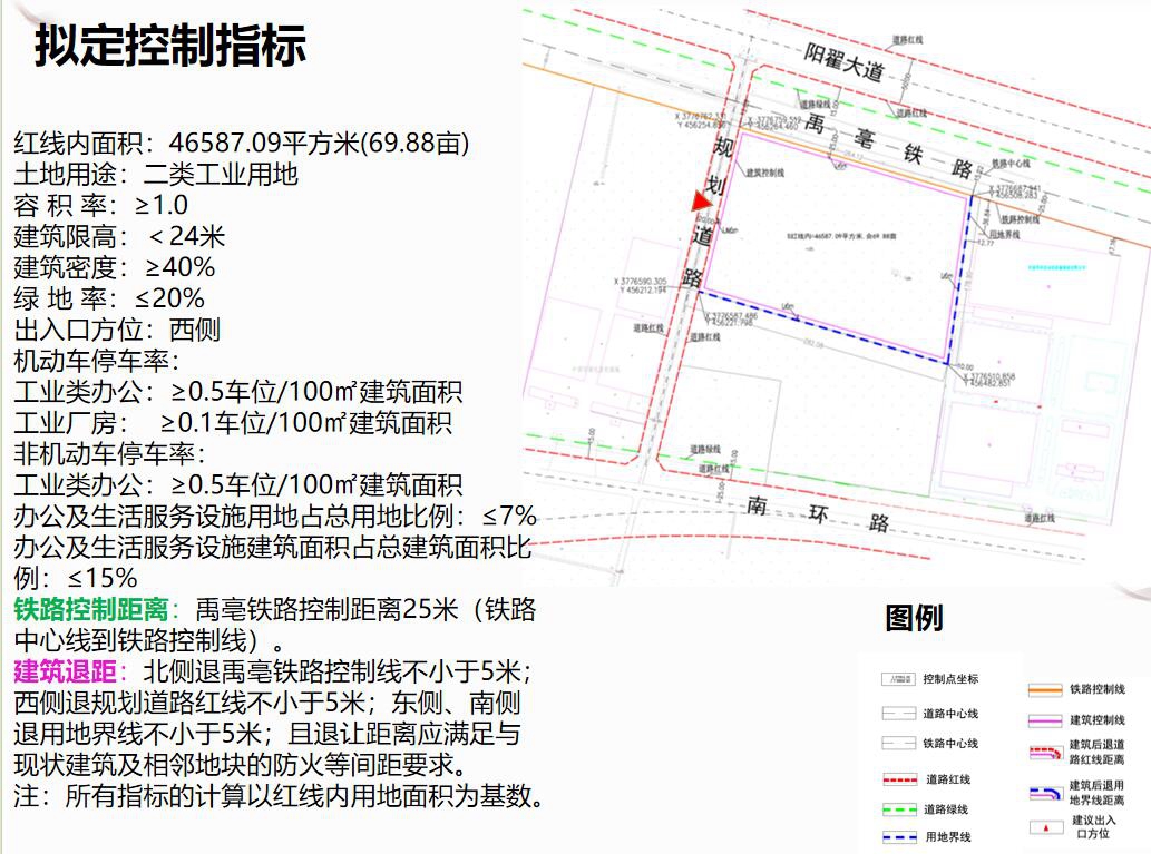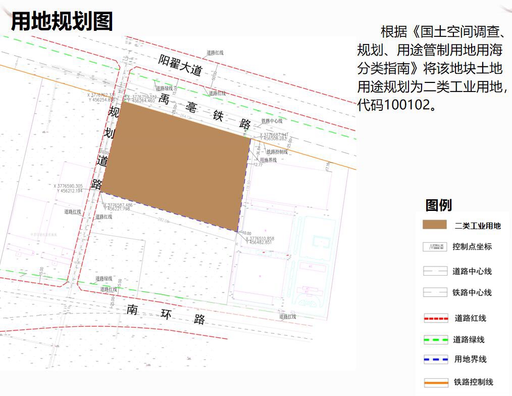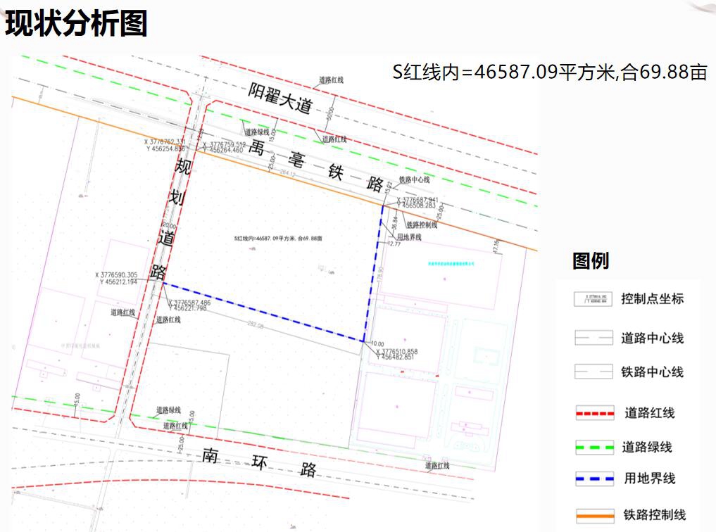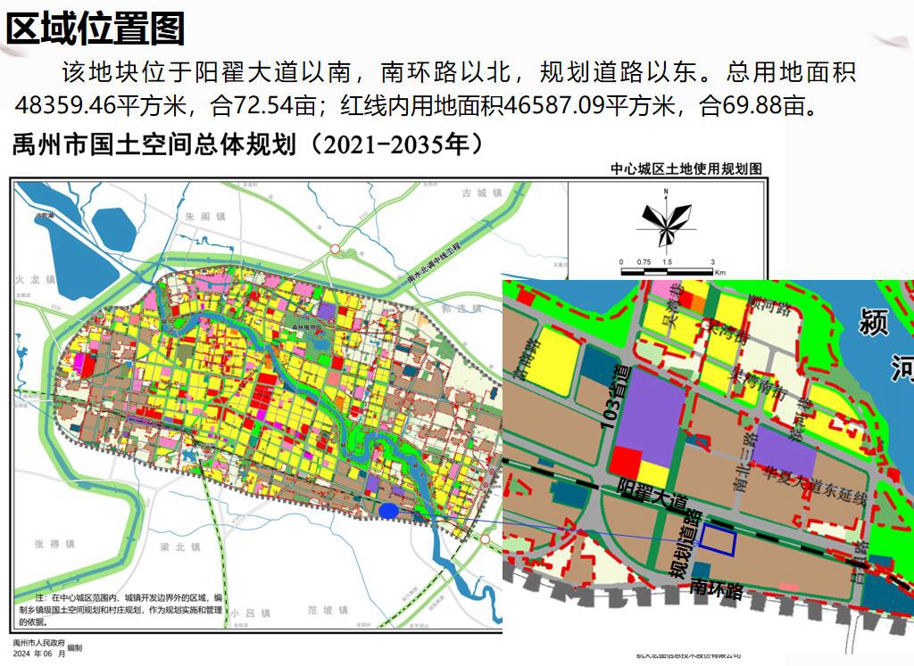 该地块位于阳翟大道以南,南环路以北,规划道路以东。总用地面积48359.46平方米,合72.54亩;红线内用地面积46587.09平方米,合69.88亩。于2024年09月03日经中共禹州市委城乡规划委员会2024年第四次会议审议通过。