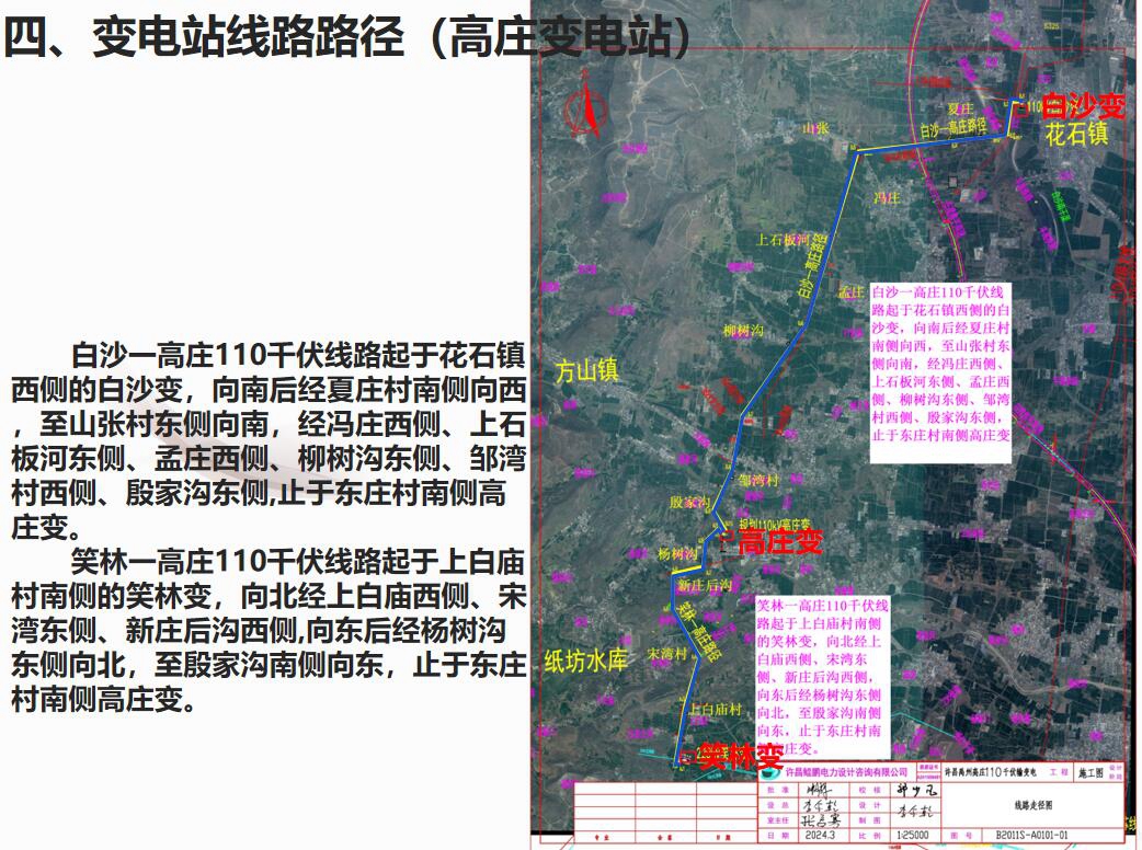 高庄变电站位于禹州市方山镇邹湾村、逯坡村交界处。规划用地面积4545.50平方米,合6.82亩。该项目符合《禹州市电力设施专项规划(2017-2030)》。白沙一高庄110千伏线路起于花石镇西侧的白沙变,向南后经夏庄村南侧向西,至山张村东侧向南,经冯庄西侧、上石板河东侧、孟庄西侧、柳树沟东侧、邹湾村西侧、殷家沟东侧,止于东庄村南侧高庄变。笑林一高庄110千伏线路起于上白庙村南侧的笑林变,向北经上白庙西侧、宋湾东侧、新庄后沟西侧,向东后经杨树沟东侧向北,至殷家沟南侧向东,止于东庄村南侧高庄变。于2024年09月03日经中共禹州市委城乡规划委员会2024年第四次会议审议通过。