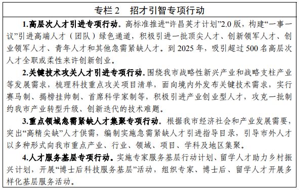 健全引才聚才长效机制。建立人才支持政策定期调整机制,以资助额度、支持重点、管理方式等为重点不断完善高层次人才支持政策。健全重点领域、重点产业人才需求预测预警和引才目录定期发布机制。完善顶尖人才引进一事一议“绿色通道”制度。支持院士以专职聘任方式在许工作,“一人一策”进行岗位安排和科研支持。鼓励支持事业单位大力引进高层次急需紧缺人才,不受事业单位岗位总量、最高等级和结构比例限制。全面实施特聘研究员制度,探索在更多领域、更大范围实施特聘制度。深入实施“许昌英才计划”,利用好“中国·河南招才引智创新发展大会”等平台,积极组织我市企事业单位参加招才引智专项活动,大力引进海内外高端人才、高校毕业生等基础人才和实用人才,推动各类人才(项目)落实落地。