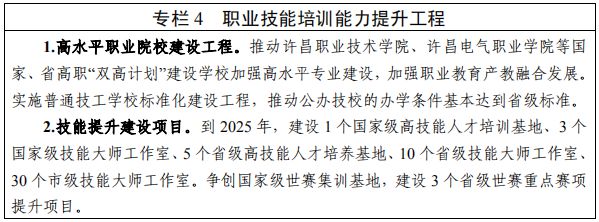 贯彻落实“人人持证、技能河南”建设,加快建设技能型社会。持续实施高技能人才振兴计划、“金蓝领”技能提升培训项目、高技能领军人才项目等,加快高技能人才培养基地、技能大师工作室等项目建设,夯实高技能人才队伍培训基础。大力推进职业教育发展,加强技工院校建设,推进“一体化”教学改革,深化产教融合、校企合作,打造品牌技工院校、特色化专业、技工教育教学名师。扩大高技能人才与专业技术人才职业发展贯通领域和规模。弘扬新时代工匠精神,加强对高技能人才表彰激励,打造“许昌大工匠”品牌,增强高技能人才的职业荣誉感、自豪感、获得感。