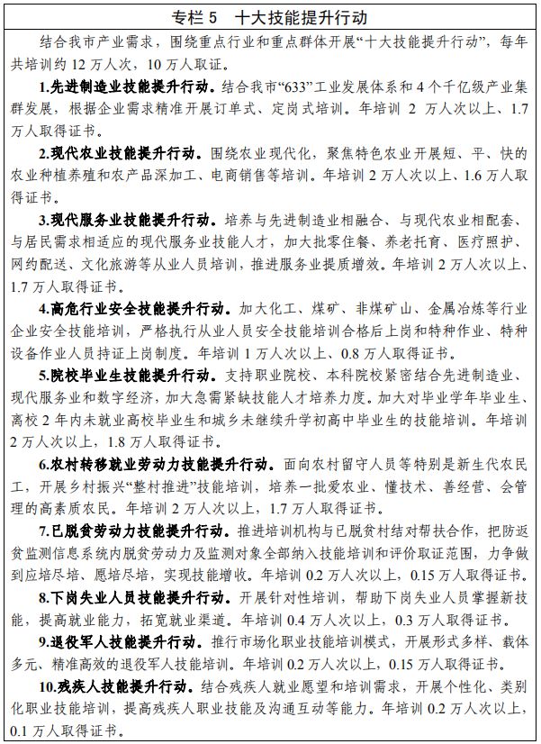 把服务制造业高质量发展作为职业技能培训主攻方向,采取超常规举措大规模开展“全劳动周期、全工种门类”职业技能培训,围绕重点行业和重点群体开展“十大技能提升行动”。紧密结合我市“633”工业发展体系和4个千亿级产业集群,开展定向式、订单式、冠名式等培训,加大企业急需紧缺技能人才供给。实施重点群体专项培训行动,稳步扩大培训规模,重点加强高校毕业生和城镇青年、农村转移就业劳动者、退役军人、脱贫人口、失业人员、个体工商户、就业困难人员(含残疾人)等技能培训,突出高技能人才培训、急需紧缺人才培训、转岗转业培训、储备技能培训、通用职业素质培训,积极发展养老、托育、家政等生活服务业从业人员技能培训,广泛开展新业态新模式从业人员技能培训,全面加强新技术培训。加强职业道德教育,引导劳动者树立正确的人生观价值观就业观,培养敬业精神和工作责任意识。