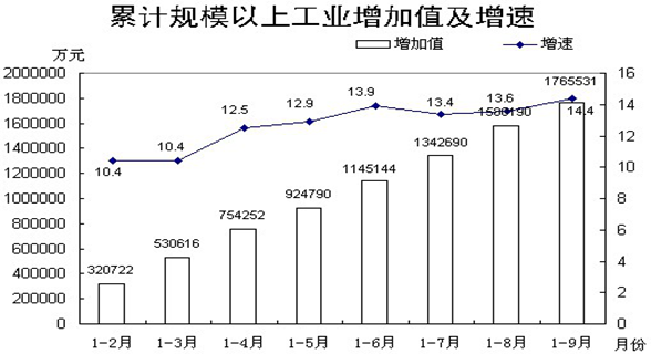 (二)工业经济持续向好。前三季度全市规模以上工业完成增加值176.6亿元,同比增长14.4%,增速较1-8月份回升0.8个百分点,较上半年回升0.5个百分点。