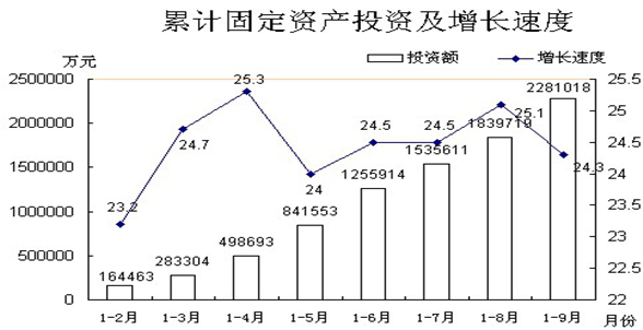 (三)固定资产投资稳步增长。前三季度全市固定资产投资累计完成228.1亿元,增长24.3%,比1-8月份下降0.8个百分点。