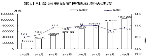 (四)消费品市场繁荣活跃。前三季度全市社会消费品零售总额累计完成104.1亿元,同比增长13.9%,比1-8月份提高0.1个百分点。