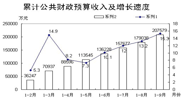 (五)财政收入持续增长。 前三季度全市公共财政预算收入完成20.8亿元,同比增长15.3%,比1-8月份提高2.1个百分点,其中,税收收入13亿元,同比增长8.0%,税收收入占公共财政预算收入的比重62.5%。